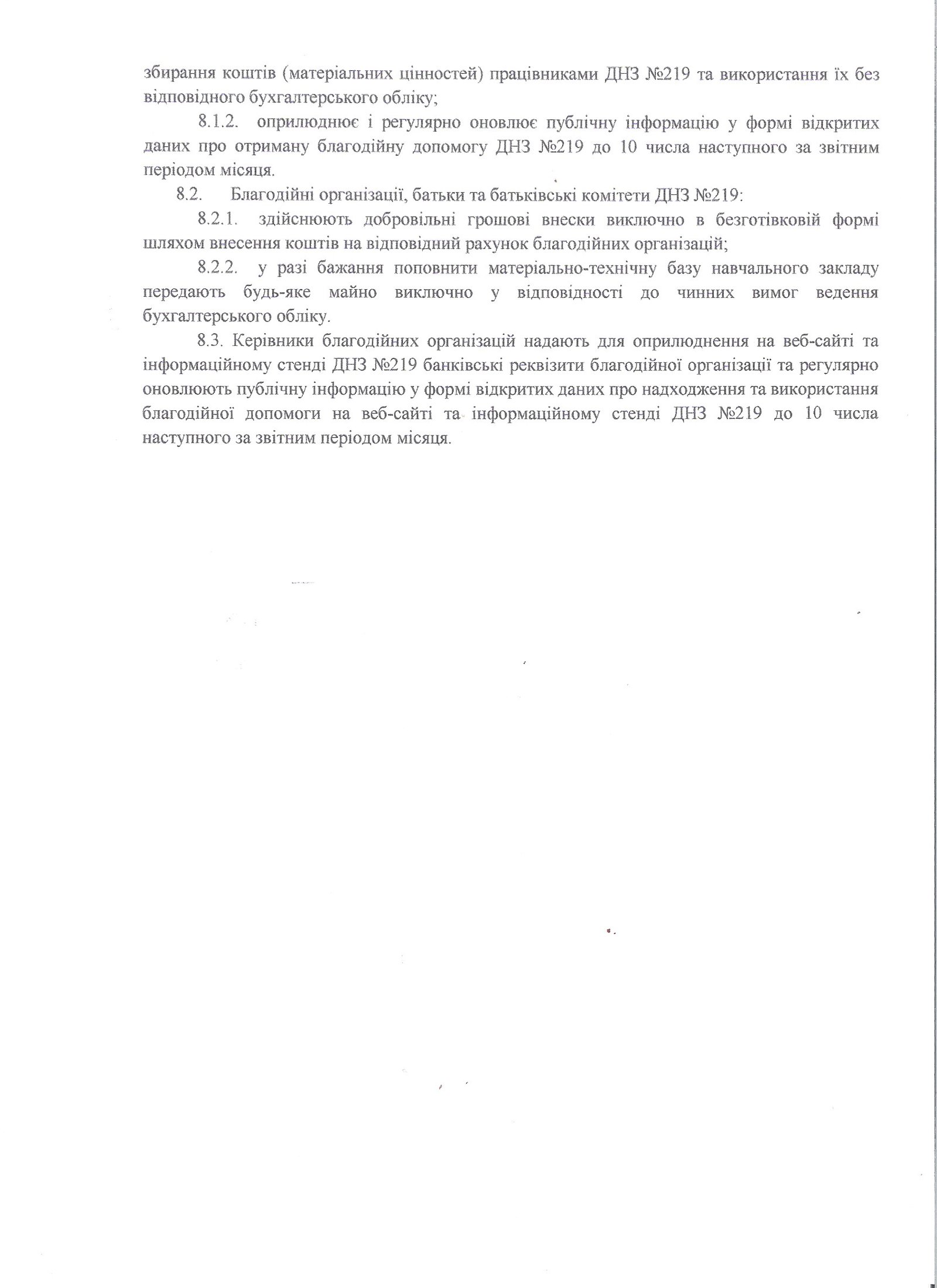 8.3. Керівники благодійних організацій надають для оприлюднення на веб-сайті та інформаційному стенді ЗДО №219 банківські реквізити благодійної організації та регулярно оновлюють публічну інформацію у формі відкритих даних про надходження та використання благодійної допомоги на веб-сайті та інформаційному стенді ЗДО №219 до 10 числа наступного за звітним періодом місяця.
