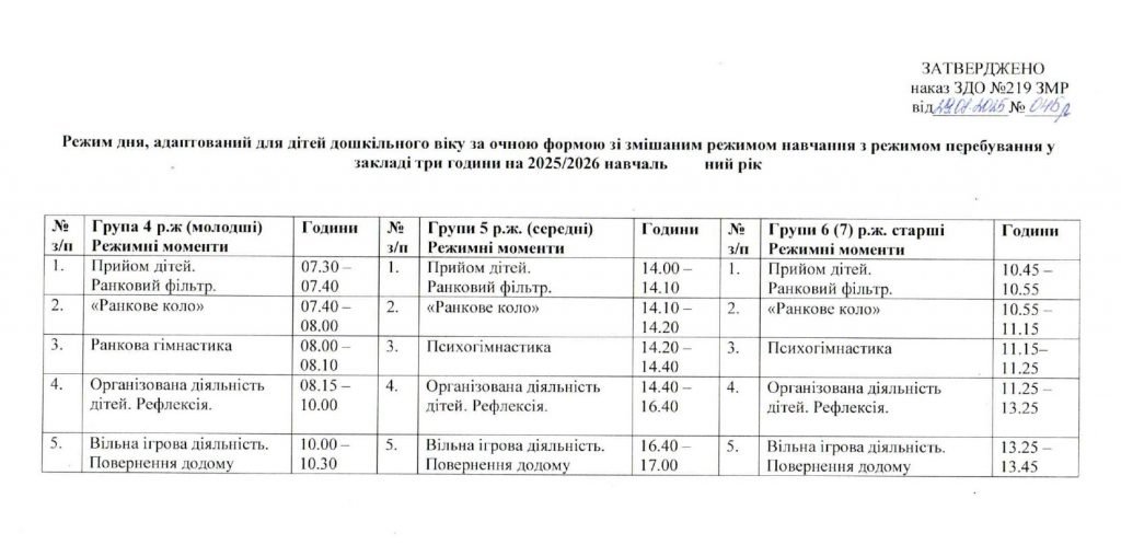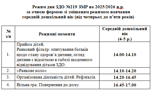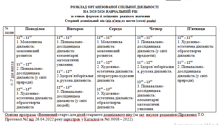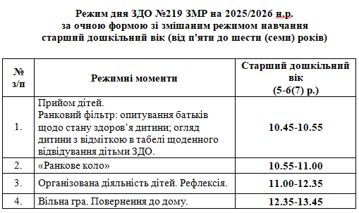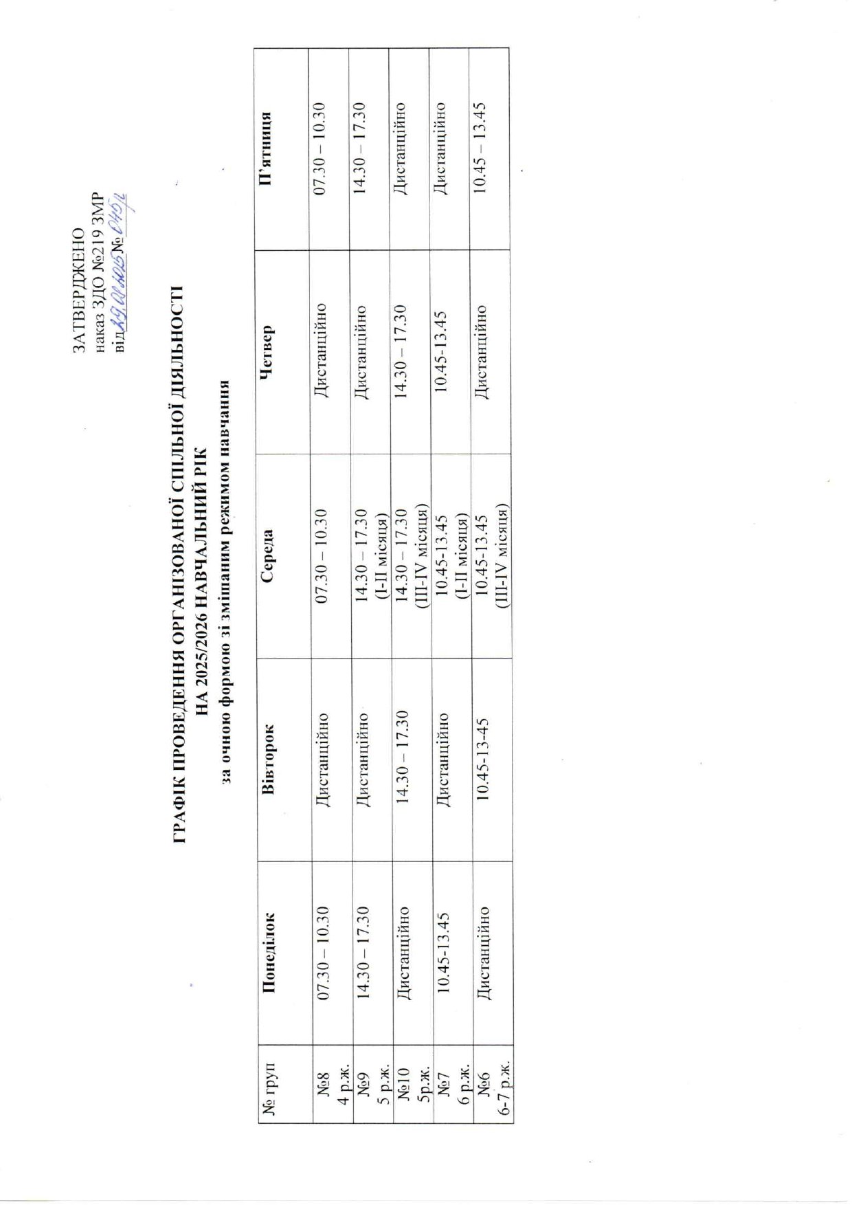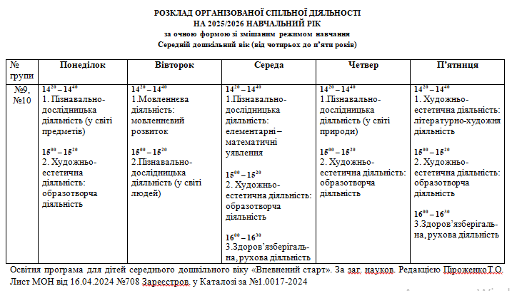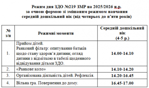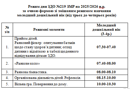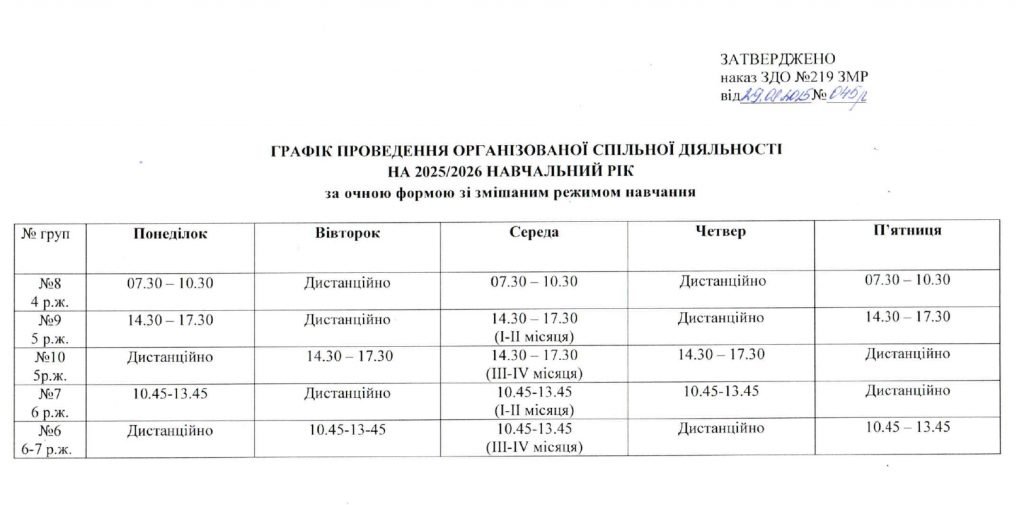З 01.09.2025 в закладі дошкільної освіти організовано освітній процес зі здобувачами освіти молодшого, середнього та старшого дошкільного віку за очною формою зі змішаним режимом навчання на час дії правового режиму воєнного стану виключно в найпростішому укритті закладу дошкільної освіти, з неухильним дотриманням безпекових вимог (рішення Ради оборони Запорізької області від 03.09.2024 №190 “Про запровадження та забезпечення заходів правового режиму воєнного стану в Запорізькій області”, рішення Ради оборони від 26.08.2025 №207 “Про запровадження та забезпечення заходів правового режиму воєнного стану в Запорізькій області”, наказу департаменту освіти і науки від 29.08.2025 №384р “Про початок 2025/2026 навчального року в закладах освіти міста Запоріжжя”.