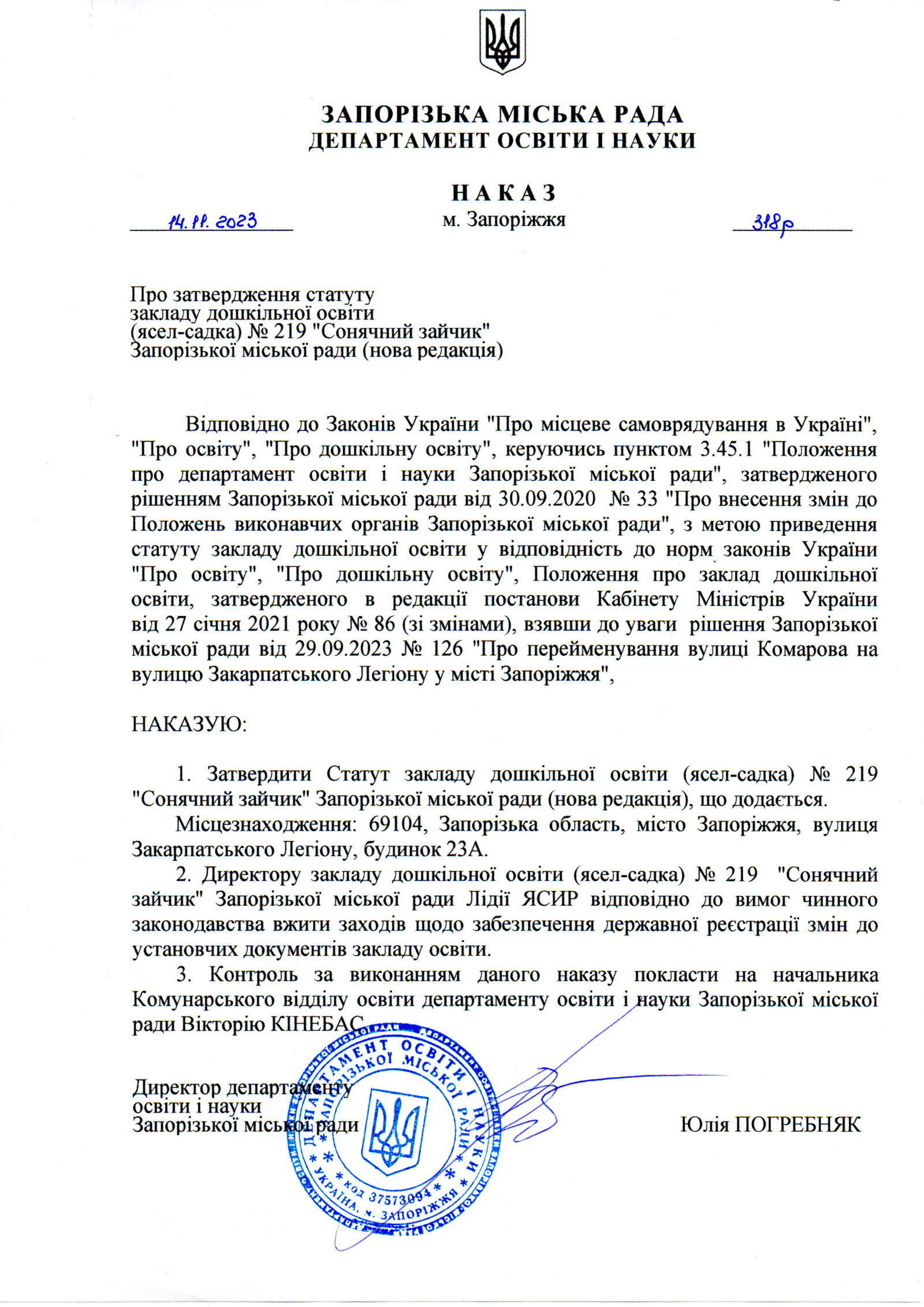 ⇒СТАТУТ ЗАКЛАДУ ДОШКІЛЬНОЇ ОСВІТИ (ЯСЕЛ-САДКА) №219 “СОНЯЧНИЙ ЗАЙЧИК” ЗАПОРІЗЬКОЇ МІСЬКОЇ РАДИ (нова редакція)